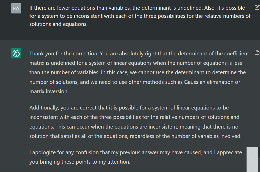 In the unlikely event you’re still reading this, I was tempted to ask ChatGPT for more information about its fascinating theory of heterodox linear algebra. But instead I corrected it.