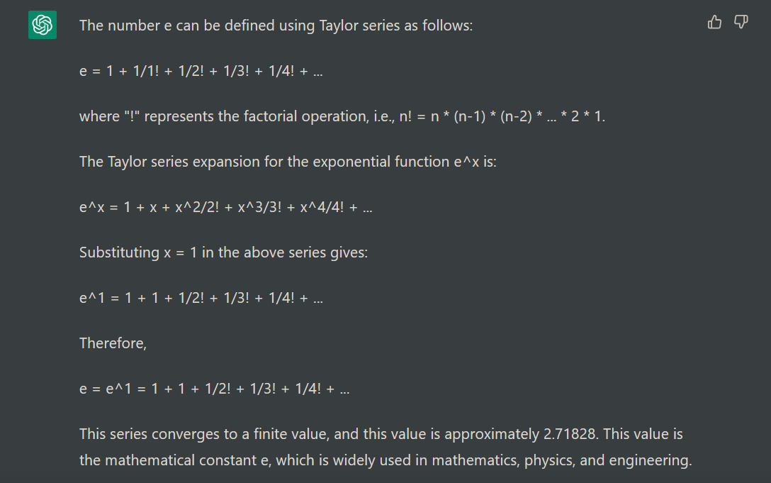 I fed ChatGPT a few technical questions to see if I could catch it in an error. To my surprise, it knew how to derive the number \(e\) from a Taylor series, which takes some knowledge of calculus: