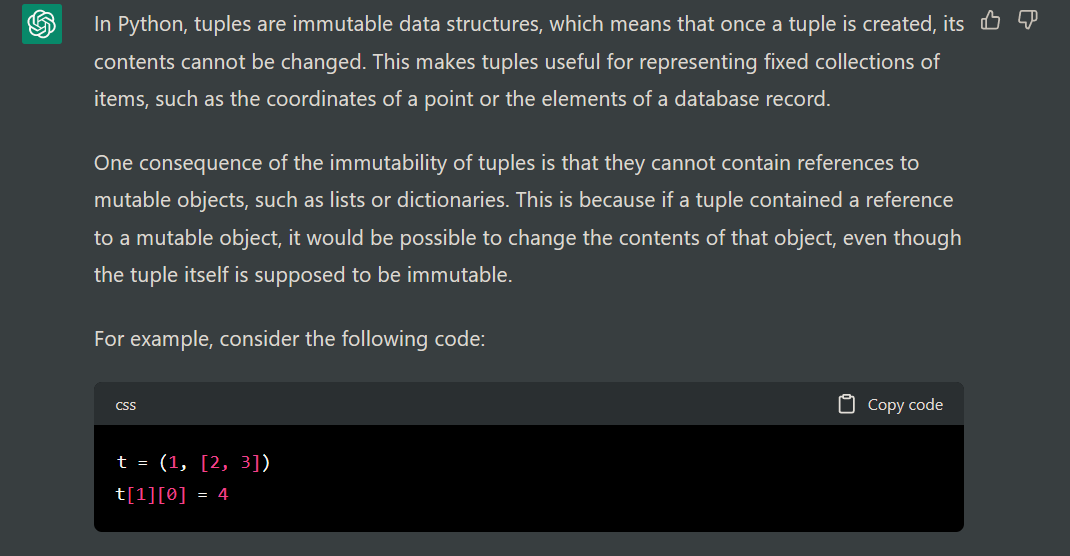 Gotcha. Actually, Python tuples can contain references to mutable objects, even though tuples themselves are immutable. It would be silly ever to do this, but you can:
